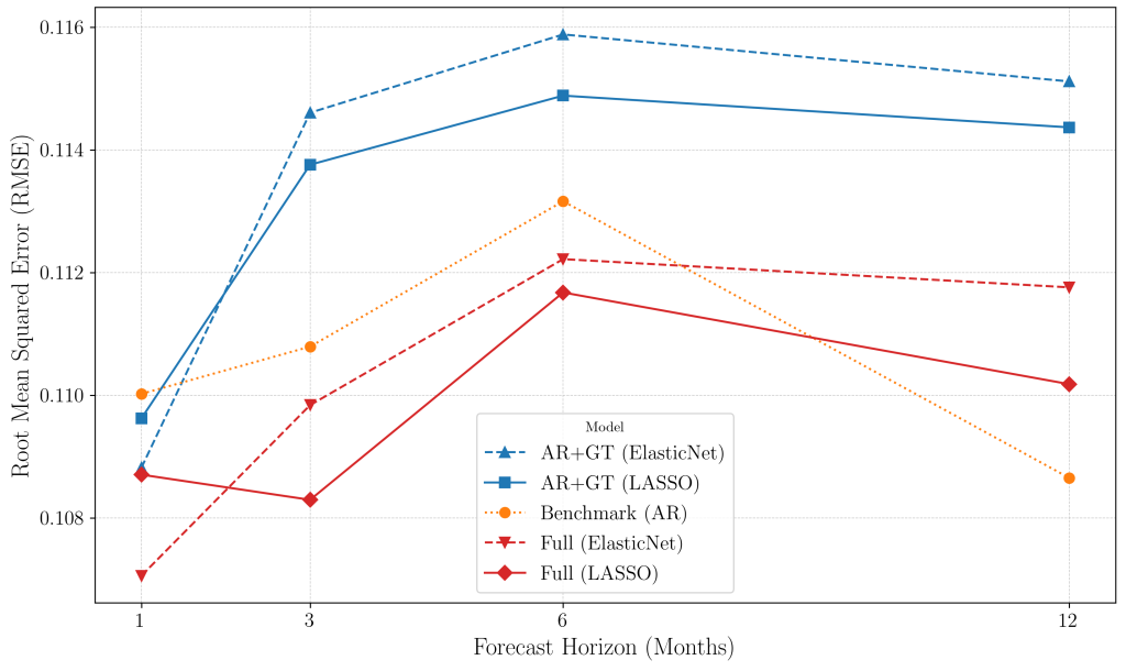 - At a 1-month horizon, GT-augmented models are most effective – excelling at real-time nowcasting.